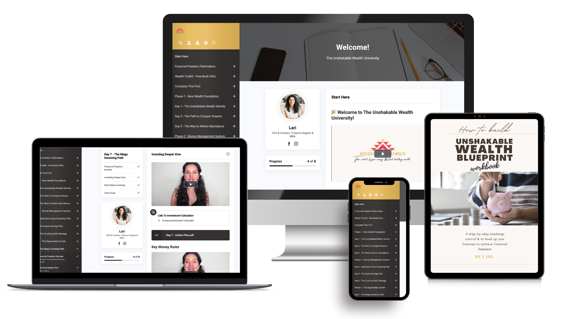 DISCLAIMER: These are not "get rich" programs - we believe only in hard work, adding value, and serving others with excellence and consistency. As stipulated by law, we can not and do not make any guarantees about your ability to get results or earn any money, build wealth or achieve financial freedom with our ideas, information, tools or strategies. Our programs take a lot of work and discipline just like any worthwhile endeavor or professional continuing education program. We don't know you and, besides, your results in life are up to you. Agreed? We just want to help by giving great content, direction, and strategies. You should know that all products and services by our company are for educational and informational purposes only. We are not CPAs, attorneys, insurance, or financial advisors and the information on this page, memberships, website and trainings shall not be construed as tax, legal, insurance, or financial advice. If you need such advice, please contact a qualified CPA, attorney, insurance agent, financial advisor or appropriate professional. Earnings and income representations made by Lari and/or anyone in our company, Accelerated Unshakable Wealth Program, unshakablewealth.com and their advertisers/sponsors (collectively, "Lari and/or anyone in our company & Accelerated Unshakable Wealth Programs") are aspirational statements only of your earnings potential or results. The success of Lari and/or anyone in our company, testimonials and other examples used are exceptional, non-typical results and are not intended to be and are not a guarantee that you or others will achieve the same results. Individual results will always vary and yours will depend entirely on your individual capacity, work ethic, business skills and experience, level of motivation, diligence in applying the Accelerated Unshakable Wealth Programs, the economy, the normal and unforeseen risks of doing business, your personal finance situation and other factors. Lari and/or anyone in our company & Unshakable Wealth Programs, and Lari individually and/or Larilu Ventures, LLC, are not responsible for your actions. You are solely responsible for your own moves and decisions and the evaluation and use of our products and services should be based on your own due diligence. You agree that the Lari & Larilu Ventures, LLC Programs are not liable to you in any way for your results in using our products and services. See our our full disclaimer of liability and other restrictions.