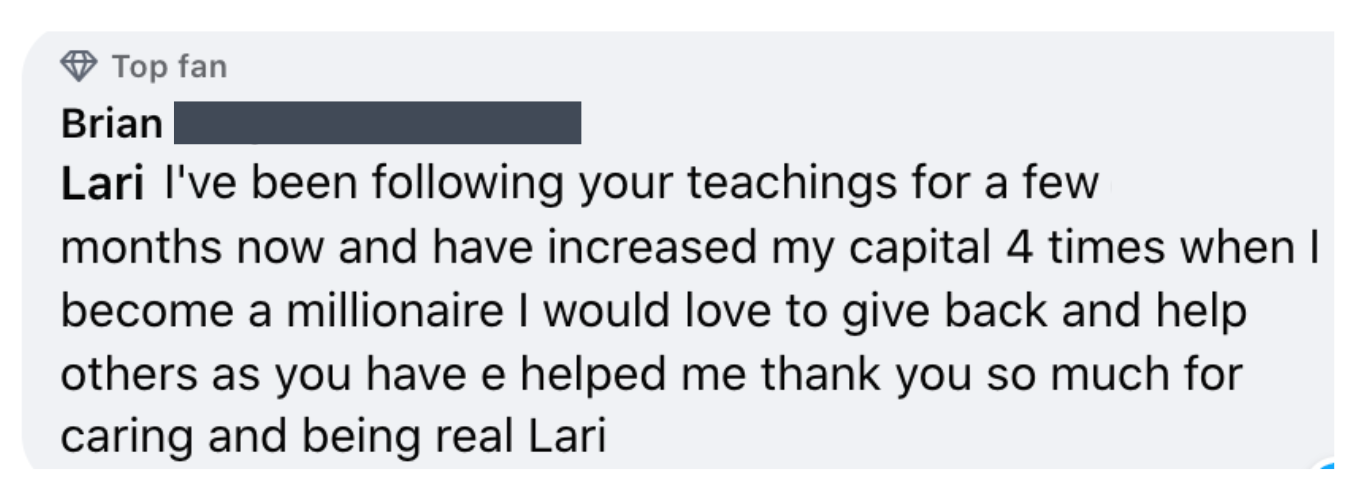 "I learned and met a lot of people, they give you guidance, but they don't show you exactly how to do it...[Lari helps] step-by-step. In life, I got an extraordinary mentor like Lari, who really helped me a lot in all [financial] ways and I trust her."